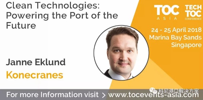 作为此次会议及展览的主要参展商代表,科尼的亚太区域销售及服务总监Michael Green先生和亚太区域销售经理Janne Eklund先生还将应邀在4月25日TECH TOC论坛上就"节能减排技术为未来港口提供动力"发表演讲。