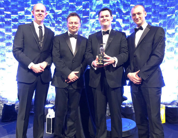 Perkins营销总监聶大卫(David Nicoll)(左一),Perkins售后市场产品总经理韦理德(Michael Wright)(左二)与开发团队成员于领奖后合照