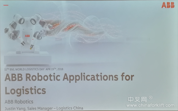 来自上海ABB工程有限公司的销售经理杨立飞先生发表了主题为《机器人在物流行业的应用发展》的演讲。