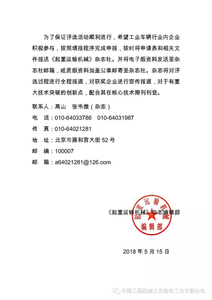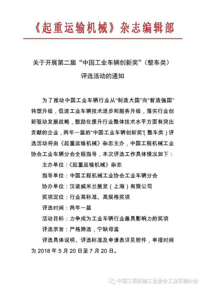 关于开展第二届“中国工业车辆创新奖”(整车类) 评选活动的通知