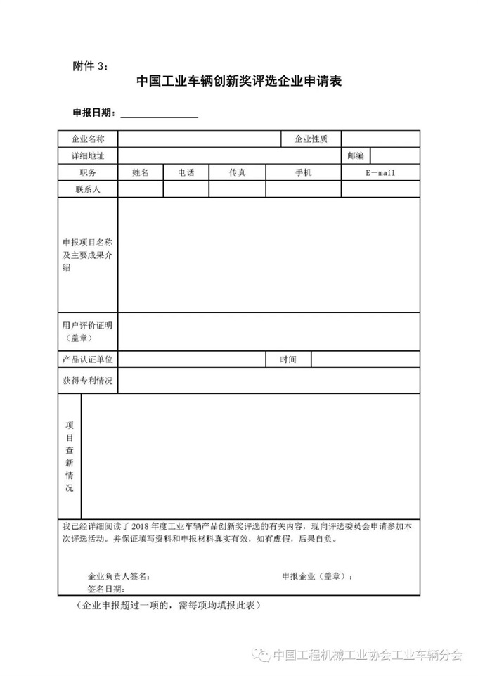 附件3:中国工业车辆创新奖评选企业申请表