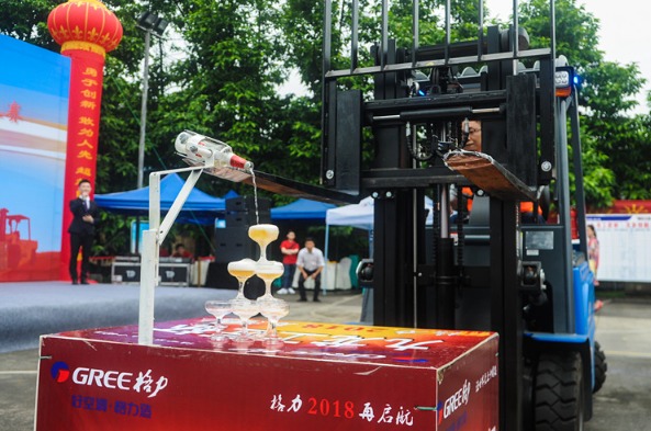 在开幕式上,一名格力公司的员工向观众演示了用叉车开啤酒瓶盖的绝活儿。他将事先准备好的1瓶啤酒固定在平台上,然后发动叉车,轻轻开到啤酒瓶旁边,眯着眼睛瞄准啤酒瓶,扳动叉车上的操作柄,低下头调整叉齿高度,直到叉齿精确定位在啤酒瓶盖下端。随着叉齿向上一抬,“嘭”的一声,瓶盖飞了起来,一瓶啤酒被干净利落地打开了,速度快且动作精准,精彩的表演也赢得了现场观众的阵阵掌声。