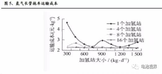 按照同样的成本分析方法,经过分析,当加氢站数量少时,运输成本可高达4.7元/Kg。随着加氢站数量的增加和加氢站规模的增大,成本逐渐降低,但是在加氢站数量较少时,成本在下降过程中出现波动。这与长管拖车利用效率有关。