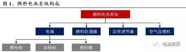 燃料电池系统是燃料电池汽车最基本的、最核心的部分。燃料电池汽车与动力电池汽车最大的不同是利用了氢氧反应生电。燃料电池系统是主要由电堆、燃料处理器、功率调节器、空气压缩机组成。每一个系统组成部件都有其特有的关键技术,其中电堆技术最为关键。