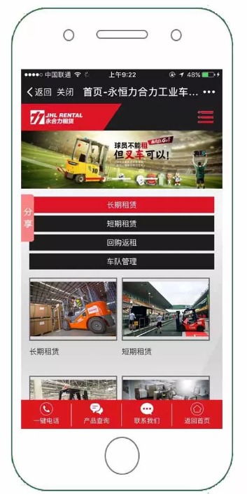 该新移动主页结构明晰,四大常见租赁服务可在首页直接点击查看;行业客户案例排在首页显眼位置,内含精心拍摄的客户视频,对于同行业客户具有很大的参考价值。屏幕最下端固定四个按键,“一键电话“可直接拨打400咨询热线;”产品查询“可直接找到涵盖永恒力和合力全系列的18大类、142款车型;“联系我们”可直接查看我们总部地址并填写反馈表单;“返回首页”按键方便用户回到首页查找信息。总之,永合力租赁在线上渠道的拓展和尝试,是力求不断努力满足客户多层次、多媒体、多平台的对叉车租赁服务的查询需求。
