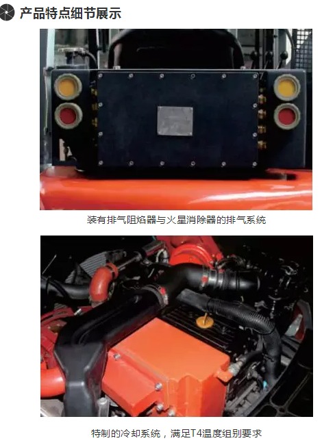本车可在有IIA、IIB级。T1~T4的温度组别的爆炸性气体形成的1区、2区以及T1~T4的温度组别的爆炸性粉尘形成的21区、22区场所使用。具有噪声小、转向轻便、性能稳定可靠、操作便捷等优点,其防爆等级达到国外同类产品的先进水平。