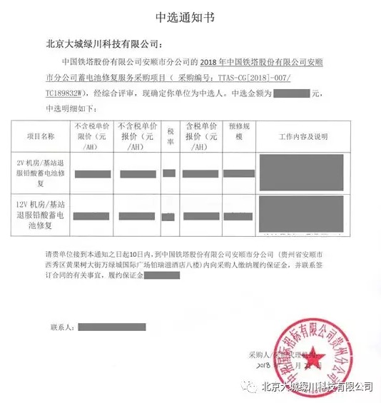 近期,由中招国际招标有限公司贵州分公司公开招标的“2018年中国铁塔股份有限公司安顺市分公司蓄电池修复服务”项目,经过与多家公司的激烈竞标,北京大城绿川科技有限公司成功中标。目前,该项目中标公示已经结束,北京大城绿川科有限公司与中国铁塔股份有限公司安顺分公司顺利签约,开始了项目的实施工作。