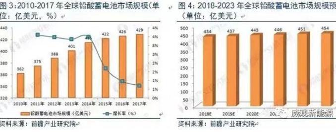 2017年全球铅酸蓄电池市场规模约为429亿美元(同比增长1%),预计未来5年将基本维持1%的增长速度。在全球市场范围内,铅酸蓄电池由于其技术成熟、安全性高、循环再生利用率高、适用温带宽、电压稳定、组合一致性好及价格低廉等优势,在电池市场占据主导地位。不过环境问题将是影响未来铅酸蓄电池市场的关键因素。铅酸蓄电池生产过程大量使用重金属铅,如果不能有效控制污染物排放,会对环境造成不良影响,铅酸蓄电池发展面临着较大的社会舆论压力。美国铅酸蓄电池的用铅量约占全国用铅总量的95%以上,由于法规健全和有效的管理,铅酸蓄电池生产造成的铅排放仅占总排放量的1.5%,2008年美国政府已将铅酸蓄电池生产从主要铅污染源中排除。除此之外,减少车辆排放和改进燃油效率,也将导致汽车用铅酸蓄电池市场的变化,预计未来5年将基本维持1%的增长速度。