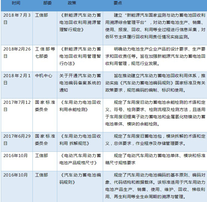在这之前,已经有《新能源汽车动力蓄电池回收利用管理暂行办法》、《汽车动力蓄电池编码规则》、《电动汽车用动力蓄电池产品规格尺寸》、《车用动力电池回收利用 拆解规范》和《车用动力电池回收利用余能检测》等政策法规出台,为动力电池的回收利用奠定了基础。