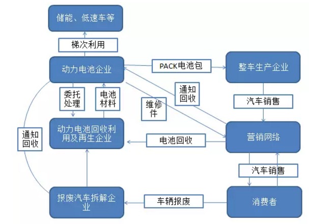 动力电池在使用达到规定退役容量时,即额定容量的80%,必须进行退役。动力电池回收利用的流程如下: