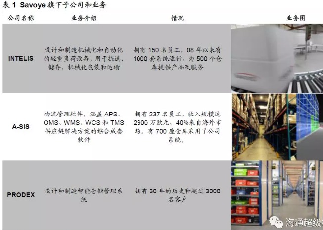 Savoye公司成立于20世纪60年代,是欧洲领先的智能物流装备制造商、软件服务商和系统集成商,提供智能仓储物流设备、供应链软件以及综合解决方案,目前在全球拥有超过900个项目实施案例。标的公司的主要应用下游包括:化妆品、医疗保健、第三方物流供应商、医院后勤、备件、电子商务、工业用品、办公用品、纺织品、零售链、娱乐和媒体产品等。