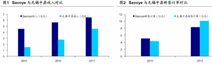 Savoye的业务规模与无锡中鼎相近,近年来业务和订单增速较快。2017年Savoye实现营业收入8500万欧元,同比增加10%,以中国人民银行公布的欧元兑人民币中间价的2017全年平均值、即1欧元兑7.63元人民币汇率计算,收入达6.49亿,高于无锡中鼎2017年的4.59亿元收入;Savoye在2017年新签订单1.1亿欧元,同比增加43%,约合8.39亿人民币,略低于无锡中鼎2017年超10亿元的新签订单;标的年末在手订单同比增加105%,也出现快速增长。2016年标的公司的主要业务集中在欧元区,欧元区收入占比达85%,2017年Savoye持续发展美国、中国、澳大利亚、意大利和智利等国的业务;在2017年末在手订单翻倍增长的情况下,我们认为标的公司2018年有望继续取得较好的业绩增长。