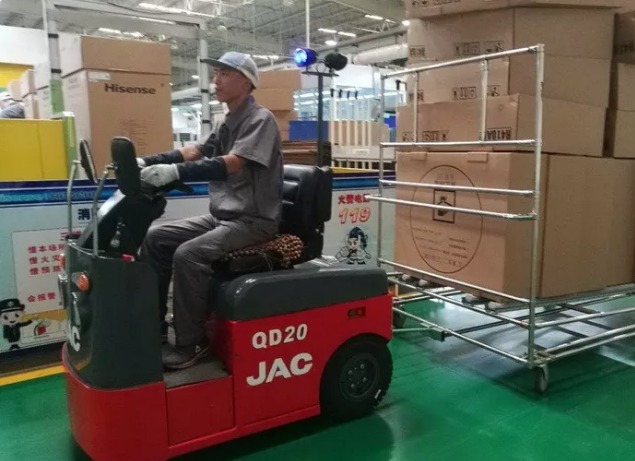 青岛海信日立空调系统有限公司成立于2003年,是由海信集团与日立空调共同投资在青岛建立的商用空调技术开发、产品制造、市场销售和用户服务为一体的大型合资企业。海信日立因对品质和精细化管理的高标准要求,厂区内生产物料上线和产成品转运等环节使用的设备要求非常高,目前使用的均是进口或合资品牌。2017年底,青岛海信日立需购置一批电动牵引车的招标讯息公布后,行业内主要国产品牌和进口品牌纷纷参与,江淮叉车积极对接和快速响应,最终凭借牵引力大、外形靓丽、转弯半径小、操作舒适轻便、性能稳定、量身定制方案等显著特点,在此次招标中顺利通过青岛海信日立严苛的选拔标准,在激烈的竞争中脱颖而出,一举中标全部12台电动牵引车,印证了江淮叉车强大的产品力和品牌力,为促进江淮叉车品牌向上突破提供有力支撑。
