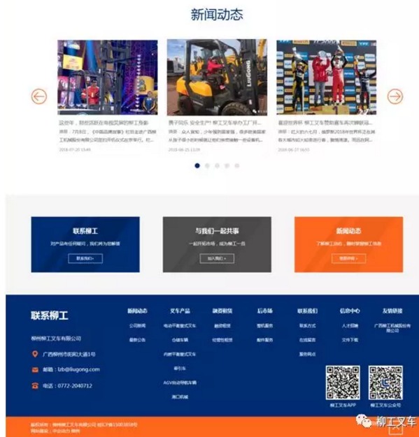 柳工叉车新网站www.lgforklift.cn进行了全新VI版面设计、自动适应屏幕、全新产品线、网站与微信同步、独创手机APP同步五大特点全面升级。