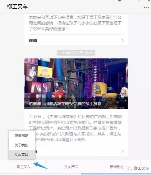 2. 进入“柳工叉车”微信公众号→点击左下角“柳工叉车”→“叉车官网”