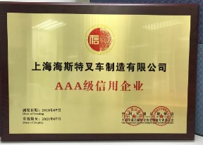 并且,上海海斯特叉车制造有限公司荣获中国交通运输协会智慧物流专业委员会颁发的“AAA级信用企业”。
