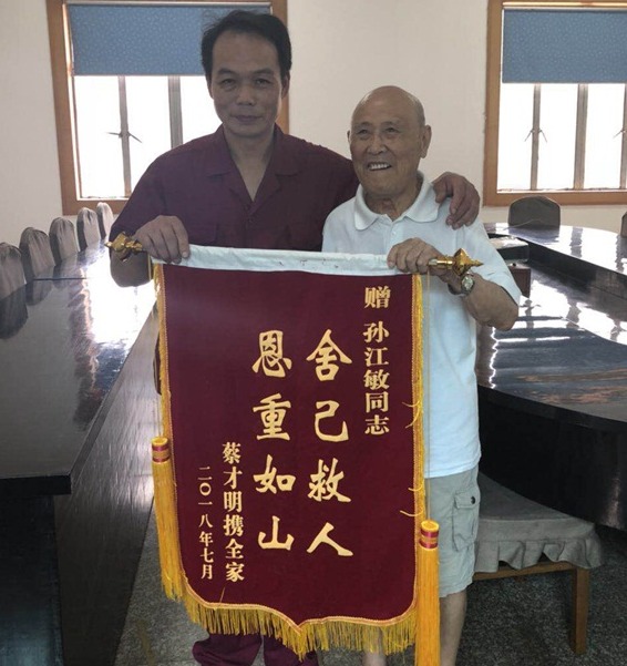 在老人获救回家后,把自己落水的事情告诉子女后,远在上海的子女通过多方查询,于2018年7月3日,老人及其子女特邀请县电视台特地来到分厂对孙江敏进行答谢并借此机会把孙江敏见义勇为的行为进行正能量传播。感谢孙江敏的救民之恩并送上一面锦旗。