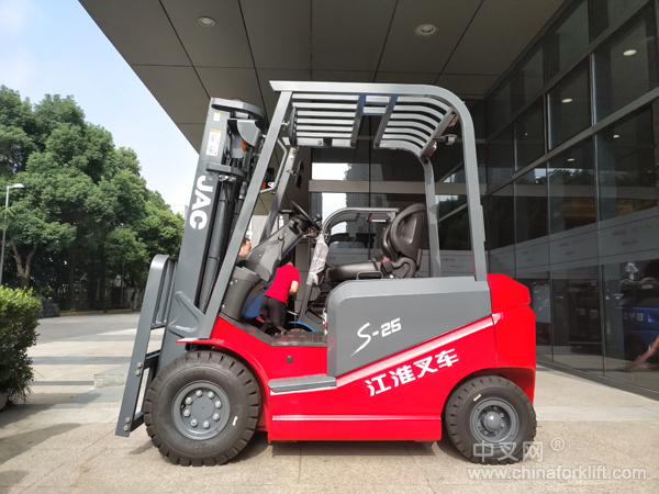 本次大会上,江淮叉车展示的CPD25S系列电动平衡重叉车采用汽车专用手制动,操作更轻松,标配OPS座椅和进口槽钢门架;封闭仪表台,外观简洁、美观;智能液晶仪表,清晰显示叉车实时运行状态;使用门架下降锁定,防止误操作造成安全事故;转弯限速功能—转角大于设定值,自动限制车辆行驶速度;全进口控制系统,性能稳定,检修便捷;桥箱一体结构设计,传动效率高、噪音低;一次充电使用时间提升25%。
