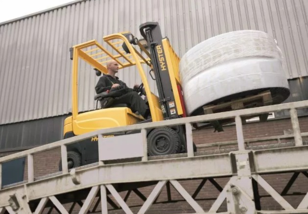 叉车上安装了一个货叉定位器,可以装载不同的托盘和各种尺寸的管轴产品。