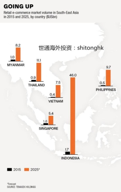 市场分散,缺乏简单的在线支付方式和强大的购物中心文化意味着电子商务在东南亚尚未像其他地区那样产生同样强大的影响。然而,近几个月阿里巴巴和腾讯都在该地区投入巨资并引入跨境支付解决方案,现在有很大的增长空间(见图表)。