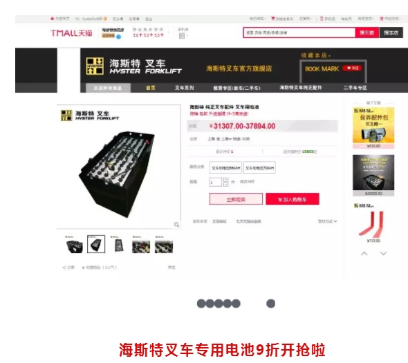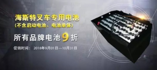 9.01-10.31之间在海斯特旗舰店购买叉车专用电池(不含启动电池、电池单体)的客户,可享受所有品牌电池9折,数量有限,约惠特价仅限2个月,火速预约!!!