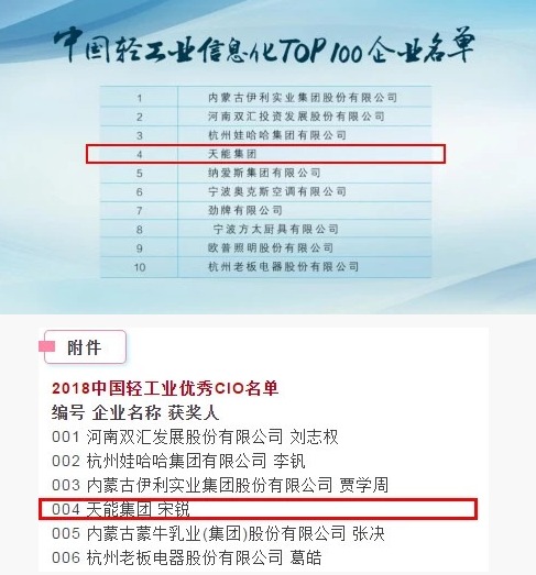 一直以来,天能集团高度重视企业信息化建设。近两年,随着“中国制造2025”的深入推进,天能加快转型升级的步伐,深度推进两化融合,以信息化建设打造动力电池智能化生产体系。此次上榜,也代表了行业领域专家对天能智能制造和信息化建设成果的高度认可。