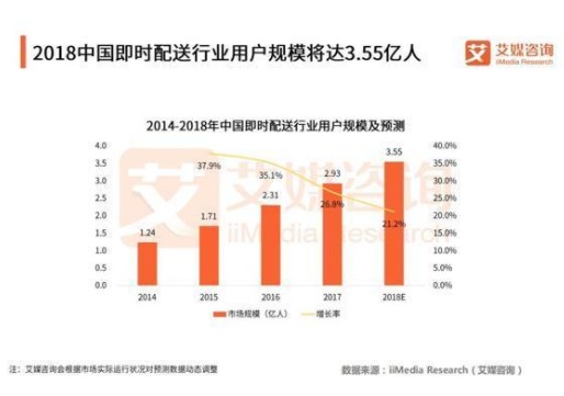 随着巨头在新零售领域的加速推进,新的物流体系也应运而生,即时配送就成了新物流体系中的主体。用户消费升级除了体现在对产品品质的追求上,时效跟服务显得越来越重要,即时配送由于快速、便利的优势备受消费者青睐。据艾媒发布的《2018Q1中国即时配送市场研究报告》,2018中国即时配送行业用户规模将达3.55亿人,在新零售的带动下即时配送需求也在加大,可以预见的是在未来即时配送行业用户规模仍有很大发展潜力。