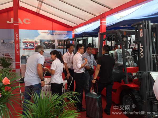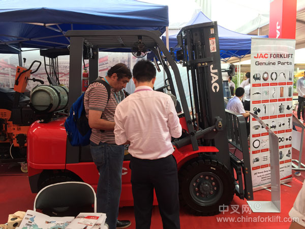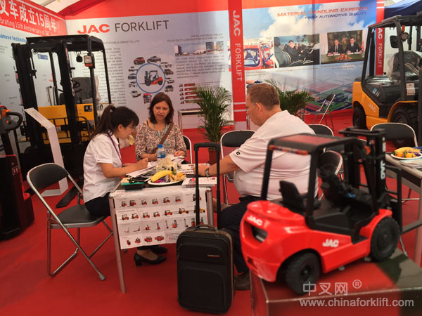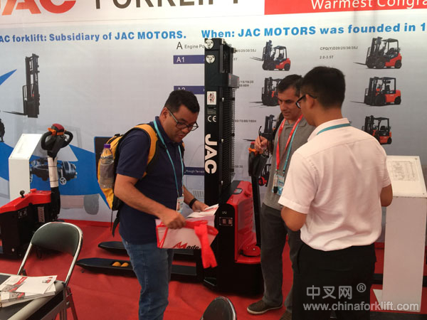 近年来,江淮叉车紧抓住市场和产品转型升级的趋势,不断拓宽产品型谱,满足多元化的市场需求,稳步推荐国际化战略,积极打造江淮叉车国际化品牌形象。通过不断参加各类海外展会,迅速了解当地市场,根据不同需求对产品进行本土化设计和创新,快速融入到海外市场中。尽管展会期间,广州出现了阴雨天气,但江淮叉车展位人气依然较旺,JAC叉车受到许多外来客商关注与咨询,部分客商在现场就与江淮工作人员洽谈合作事宜。