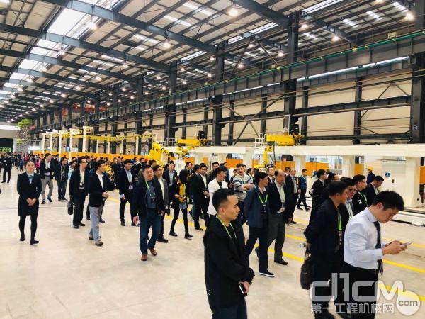 中国工程机械工业协会常务副会长兼秘书长苏子孟、中联重科董事长詹纯新及中联重科高层、客户一同参观生产线