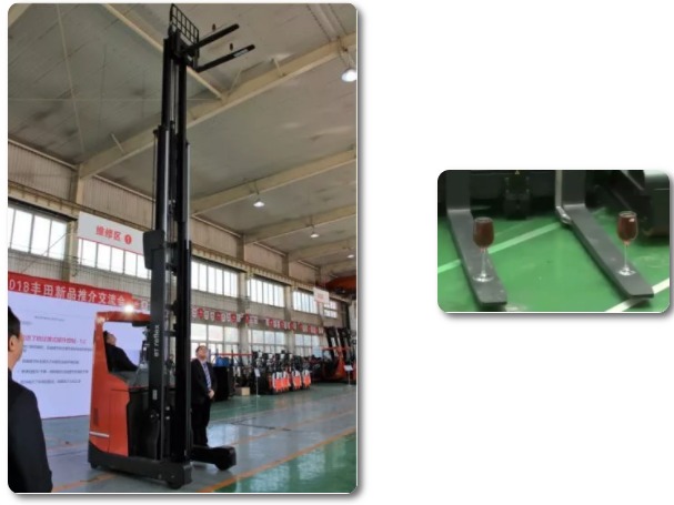 现场用盛满水的玻璃高脚杯放置于货叉前端进行了举升稳定性展示,全程无一滴外溢。