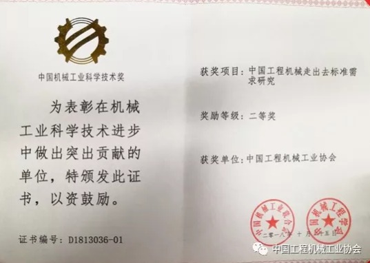 2018年度中国机械工业科学技术奖评审工作已经结束,经中国机械工业科学技术奖评审委员会和中国机械工业科学技术奖管理委员会批准,由中国工程机械工业协会(以下简称“协会”)申报的《中国工程机械走出去标准需求研究》荣获了2018年度中国机械工业科学技术奖二等奖。