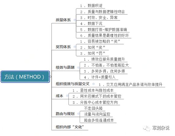 方法是一个分拣中心的灵魂所在,直接决定了分拣中心的存在价值与利用效率,与人、设备、货物、信息、环境、IE等全部有交叉关系,所以方法这一模块里面会看到较多的交叉。方法的直接目标是呈现分拣中心的价值,质量体系一定是所有结果输出中首当其冲的一项,其次内部的奖罚体系能够体现内部管理的风格与方式。薪酬与绩效是从内驱方面拉升效率与人员稳定性的重要组成部分,是方法中较为常用的一项。其中军刺会重点说绩效的利用方式,如何利用绩效与质量、效率的交叉进行互相提升。路由规划是隐性而又重要的的方法论,理不清楚路由规划便对分拣中心内的货物流动没有脉络感知。最后一个小中心内的“文化”将如何理解?
