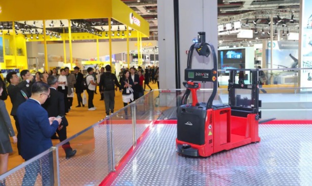 德国林德搬运机器人,采用自然导航系统,可在与人配合的共同环境中灵活行走,按指令完成货物搬运。