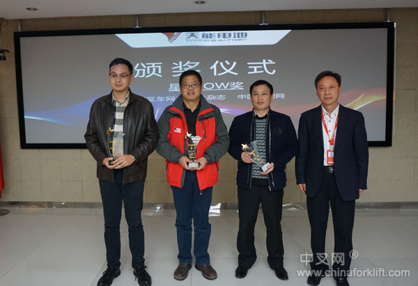 活动期间,天能为了感谢行业媒体对天能发展的关注和支持,加强彼此间的交流与信息互通,引导正面宣导企业的同时,提升了行业整体形象,颁发了不同奖项给与不同领域的代表性媒体。中国叉车网(www.chinaforklift.com)荣获天能电池颁发的2018年度优秀合作伙伴“星show奖”。