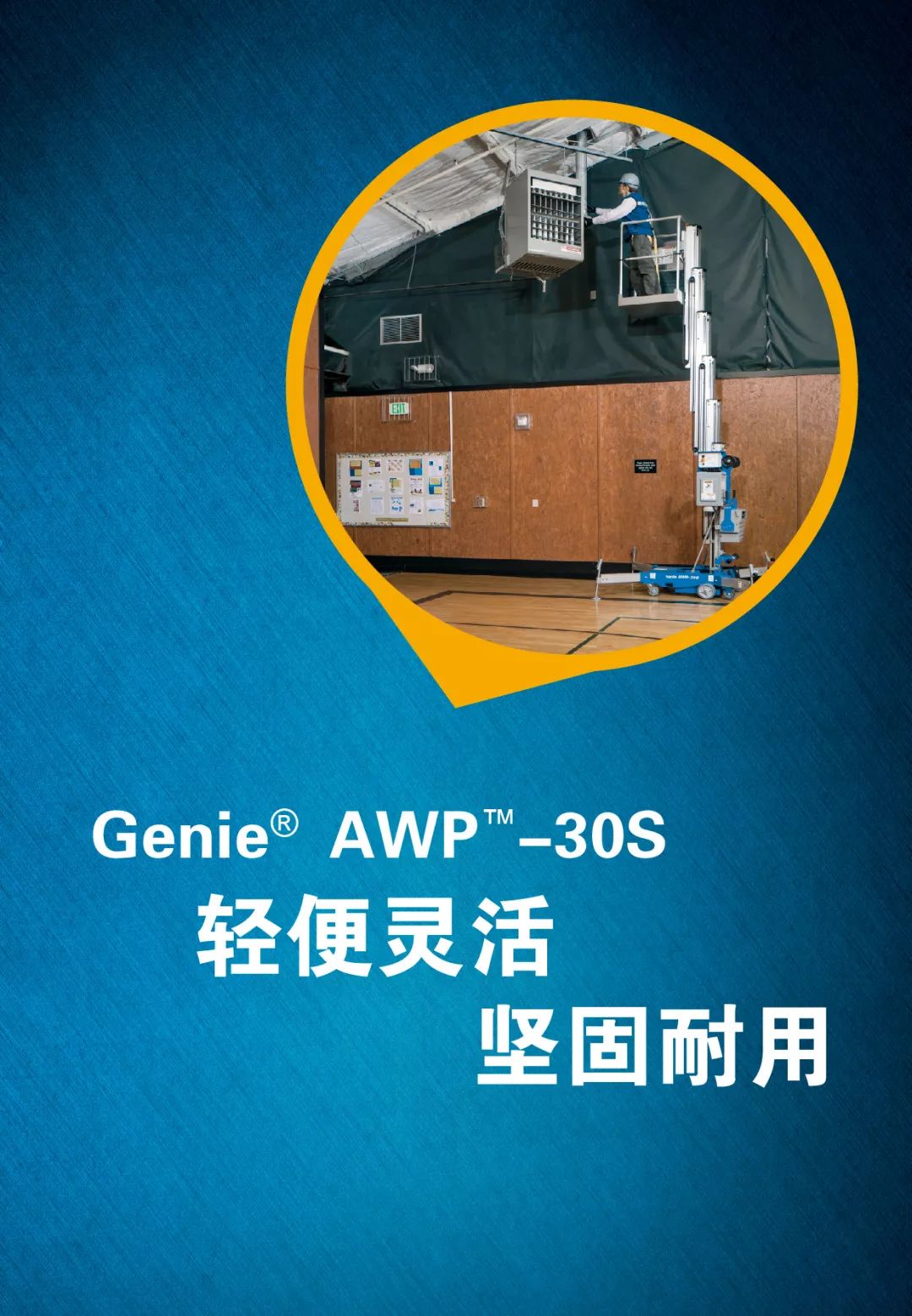 Genie AWP超级系列高空作业平台以使用轻松,方便灵活的特点成为业内宠儿。吉尼荣获专利的桅杆系统在业内是最坚固的,其坚固的航空用铝制桅杆为用户在任意高度提供舒适性和安全保障。Genie AWP -30S工作高度可达11米,承载能力159公斤,独特的后倾结构可以轻松通过标准门道。