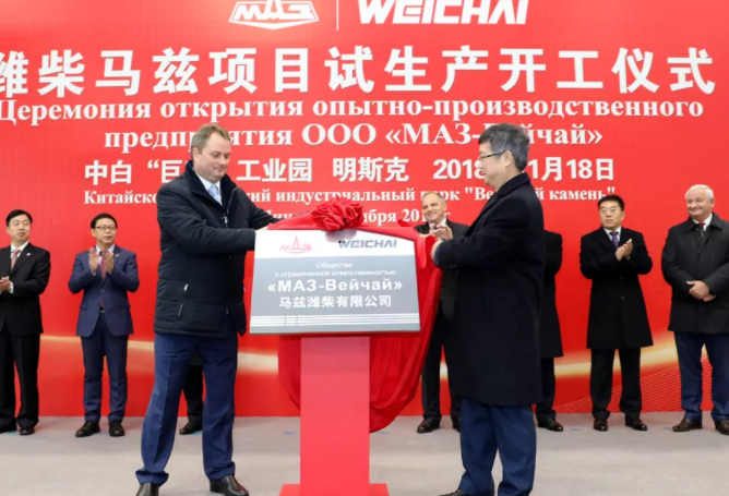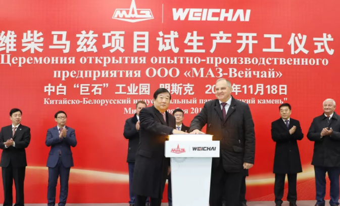 潍柴马兹项目在中白“巨石”工业园开始进入试生产阶段,现场举行了开工仪式。中国驻白俄罗斯大使崔启明和白俄罗斯工业部部长乌秋平共同为马兹潍柴有限
