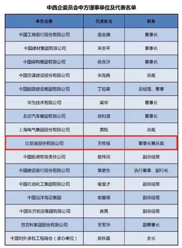 比亚迪董事长兼总裁王传福作为企业家代表受邀参加“中西企业顾问委员会”成立大会暨第一次大会。作为理事成员单位,比亚迪王传福在成立大会上表示,“感谢政府给企业提供‘中西企业顾问委员会’的平台,相信‘中西企业顾问委员会’会非常有利于扩大和加深中西双方的合作。比亚迪希望用电动车解决城市污染问题,用轨道交通、特别是中小运量的轨道交通解决城市拥堵问题。在西班牙,比亚迪已经陆续在瓦伦西亚等多个城市收获电动车订单。”