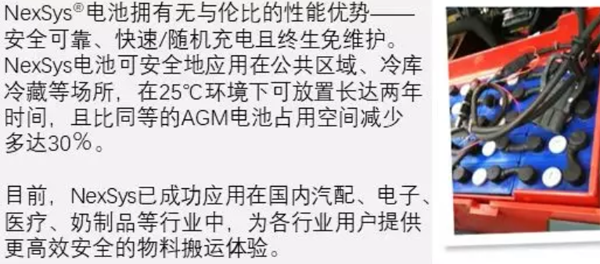 “我们非常高兴能够达成这一里程碑式的项目合作,这意味着NexSys电池在物料搬运行业中得到越来越多的认可。客户不再需要购买维护成本高昂且充电时间漫长的电池来为他们的叉车车队供电。” Tim Wittig总监说,“NexSys®电池独特的TPPL技术可以节省大量人工维护作业——比如日常加液和每周均衡充电。”