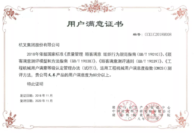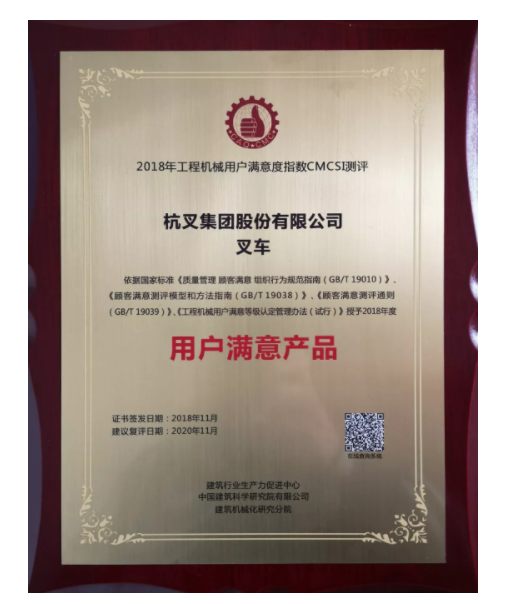 杭叉产品的用户满意度达到80分以上,获得“用户满意产品”的荣誉。