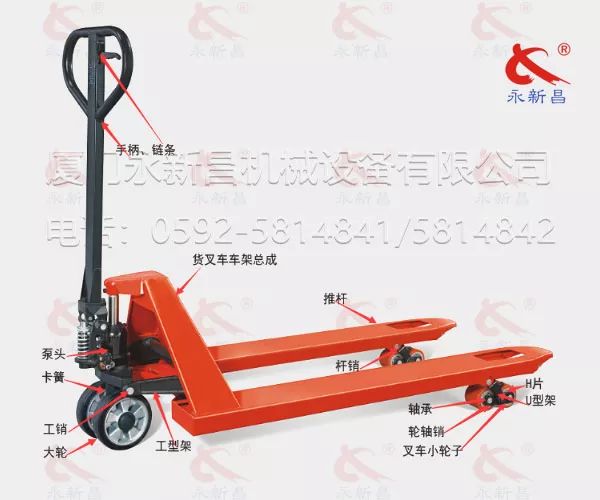 五、手动叉车配件还有轮轴销、H片、U型架、轴销、卡簧、开口销、推杆、杆销、工型架、工销、手柄总成、液压泵头总成、货叉车架总成等等。