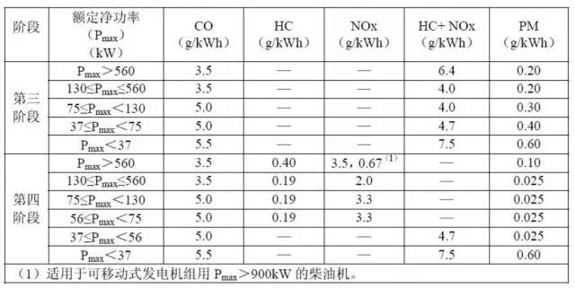 非道路移动机械国三及国四排放污染物限值对比