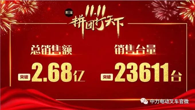 2018年11月11日,借助阿母工业线上“百团大战”活动风风火火的开启,中力叉车仅仅只用1天时间,最终以超过2.6亿销售额,2万3千台量的业绩再度霸屏。