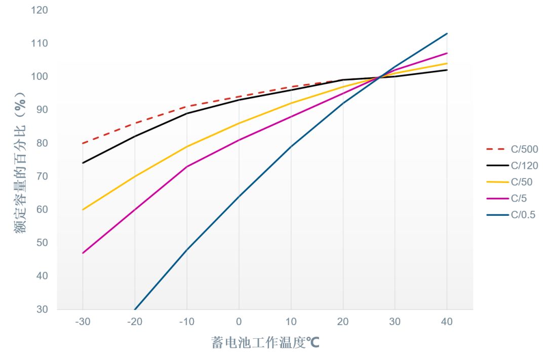 一般情况下,蓄电池的最佳使用温度是25°C左右。温度每下降1°C,蓄电池的可用容量会下降0.8%左右;温度升高后,蓄电池的容量才恢复正常。在寒冷天气里,尤其是北方地区,温度会下降到零下几度,甚至几十度,这个时候蓄电池的可用容量就会大幅下降,性能表现也会变差。