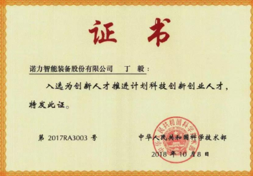 诺力股份董事长丁毅入选科技部“创新人才推进计划科技创新创业人才”,成为2018年度湖州市唯一一位入选者。