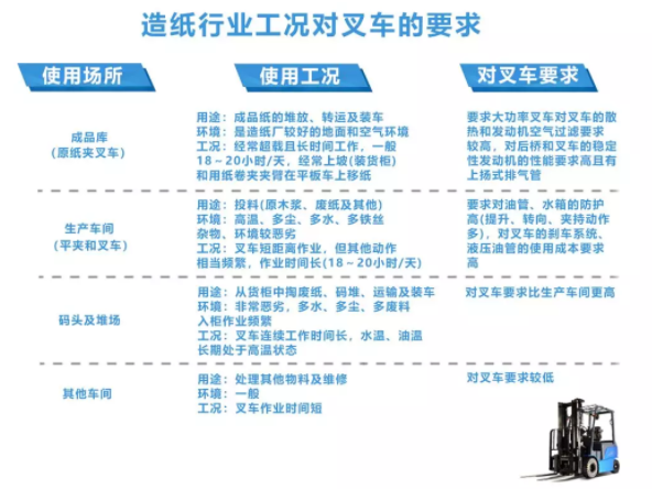 众所周知,叉车在造纸业的运输环节中有着重要使命,其涉及到的环节包括废纸、木浆、辅料仓库的装卸和拖运以及成品的装车出货等。除了工况繁重外,造纸行业的生产特性还要求叉车具备动力强、稳定性强等多种能力。