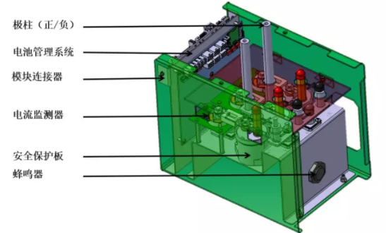 永恒力锂电池主要由极柱(正/负)、电池管理系统、模块连接器、电流监测器、安全保护板、蜂鸣器等部件组成。