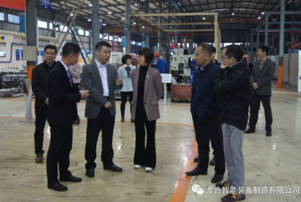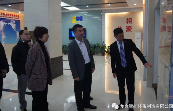 在公司杨静董事长、邱崇智总经理陪同下胡局长一行参观了龙合智能公司展示大厅及生产车间,了解了公司近几年的经营及进出口情况,对龙合智能公司近几年的发展给予了高度的赞赏和认可。