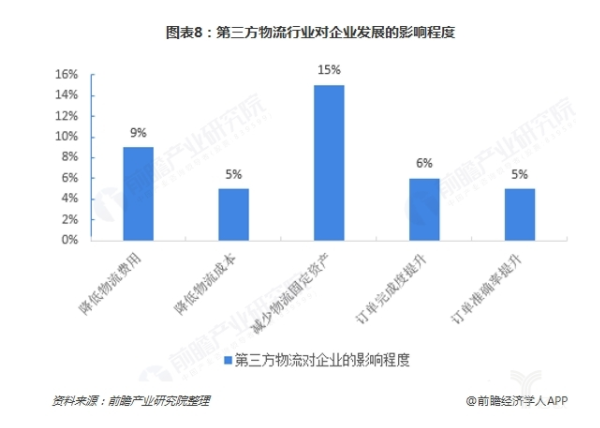 从第三方物流对企业的降本增效效果来看,在降低企业物流费用、降低仓储成本、减少物流固定资产、提升订单完成度以及定点准确率方面,分别有9%、5%、15%、6%以及5%的提升效果。