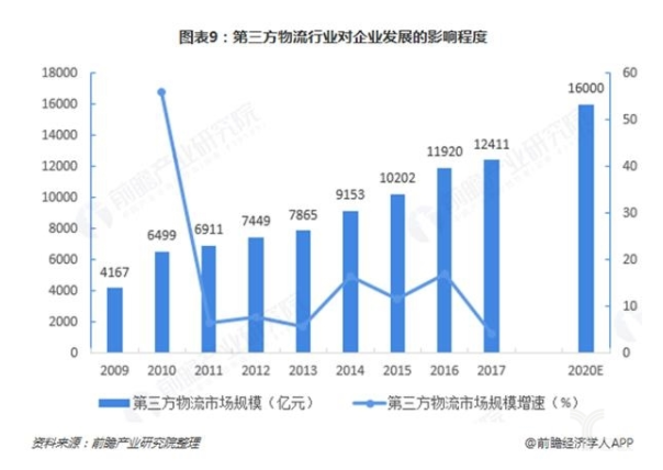 自上世纪90年代中期,第三方物流伴随现代物流理念传入我国。中国第三方物流收入呈现快速增长态势。2009年至2017年,短短八年间,总量由最初的0.41万亿元增加到1.2万亿元。未来,随着我国企业对第三方物流需求的不断增加,预计到“十三五”末期市场规模将达到16000亿元左右。