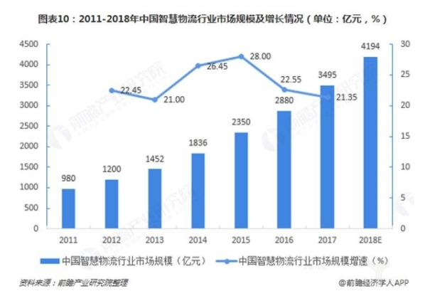 其实从发展方向来看,第三方物流也可看成智慧物流的一种。2011-2017年,中国智慧物流行业市场规模不断上升,且增速都保持在20%以上。2017年,中国智慧物流行业市场规模达到3495亿元,较上年同比增长21.35%。智慧物流是传统物流与互联网结合,达到更高效的目的。未来传统物流结合智慧物流并且融入第三方物流的协调发展,会使整个物流行业真正的实现突破。